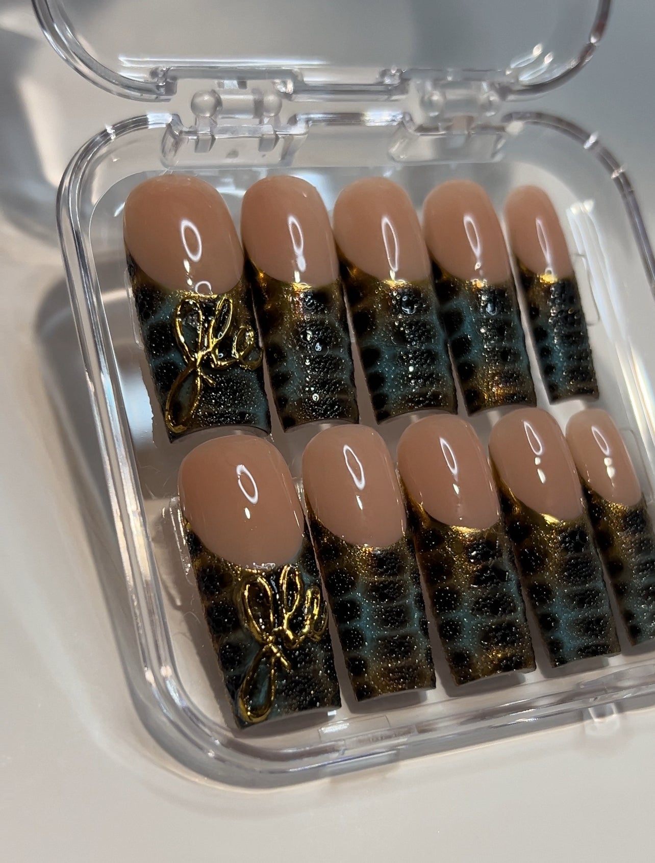 Gold nameplate nail can be purchased as an add on to a custom set or to one of our curated collections.